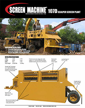 The Scalper 107D Double Deck Screening Plant is a patented, heavy-duty screening plant that is perfect for two product separation. Ideal applications include soils screening, removing vegetation, rocks and even scrap metal. This tough machine is built with USA-made Grade 80 steel plate and a heavy-duty reinforced tubular structure. The hydraulic landing gear and hydraulic axle raise and lower make the Scalper 107D “screening ready” in minutes. It is a unique dual screen processing plant featuring 10′-0″ x 7′-0″ (3m x 2.1m) double deck screens with a protective center support that matches up to your 3-5 yard (2.5-4m) front end loader.